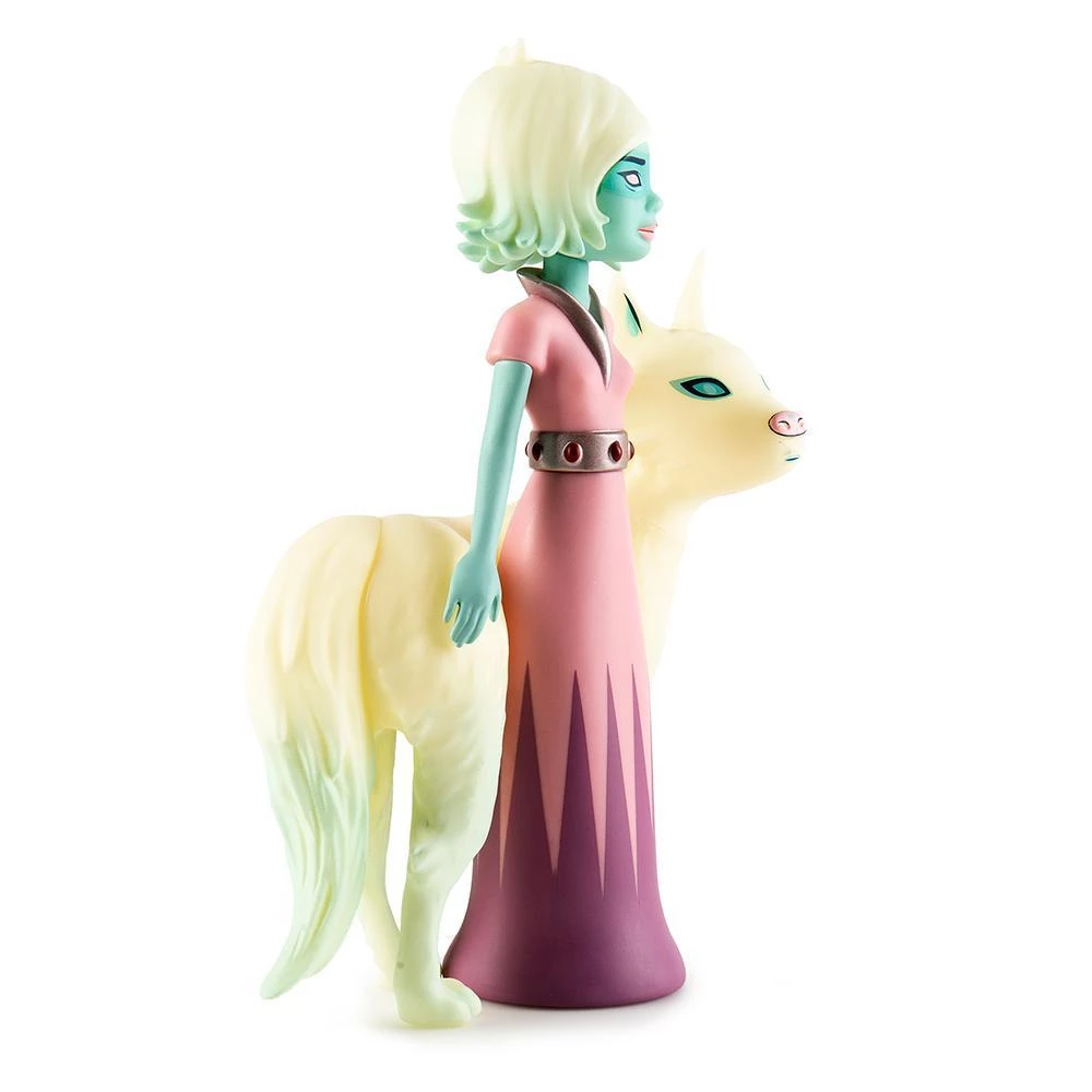 From a world where children navigate the Dreamwell to find their friends, Astra and Orbit can be found beyond the lucid seas and pink skies. Beneath the colors of the Dreamwell borealis, this mystic couple stands elegantly to assist in your journey beyond sleep. Based on the whimsical card game, Dreamwell featuring original characters by New York artist Tara McPherson, the Limited Edition Astra and Orbit 8” Art Figure brings an elegant reminder of a world beyond our own.