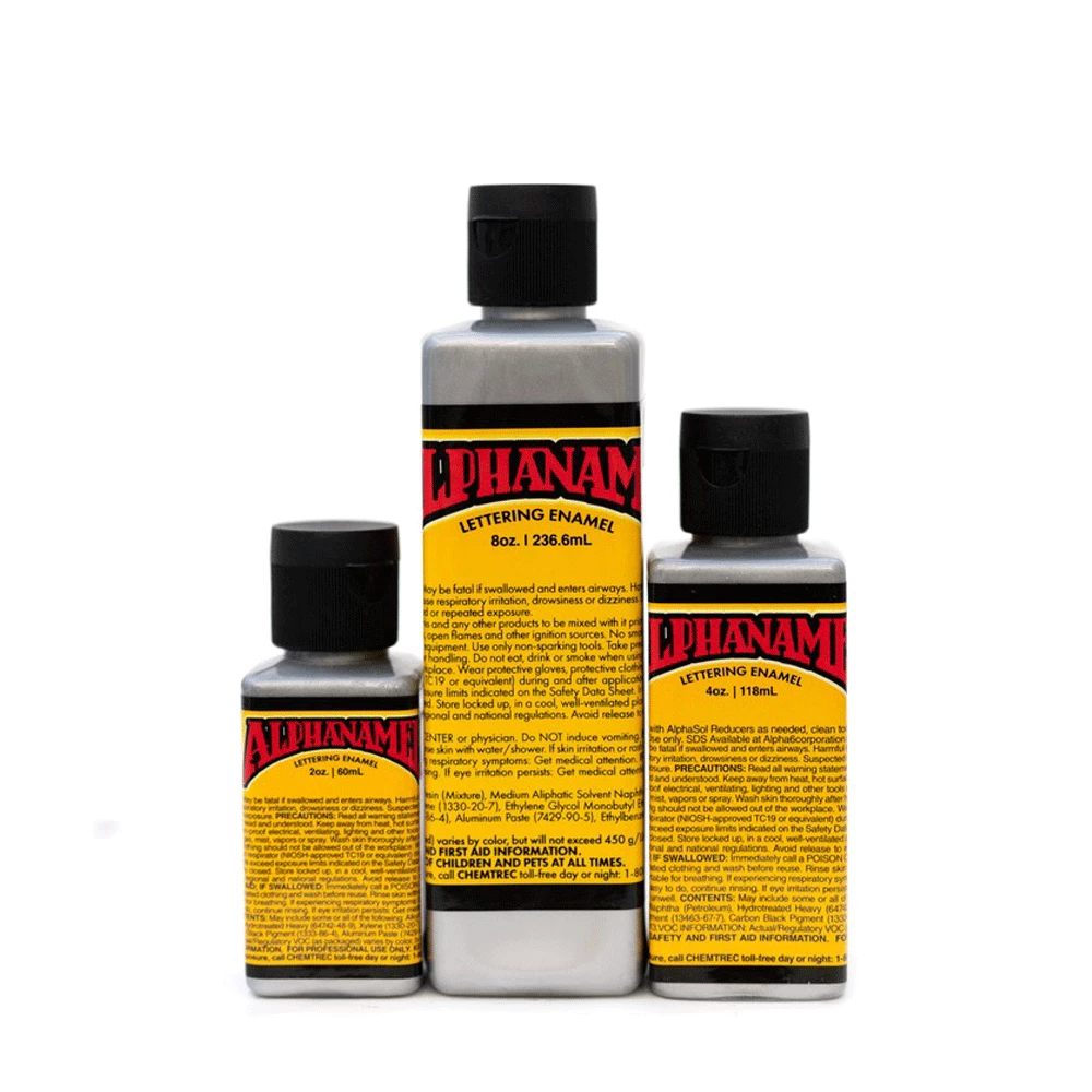 Alphanamel – professional signwriting and pinstriping enamel paint. Better coverage, smoother flow, higher gloss and longer lasting than other striping/lettering enamels on the market. Comes with Alpha 6 rattlers inside the bottle!