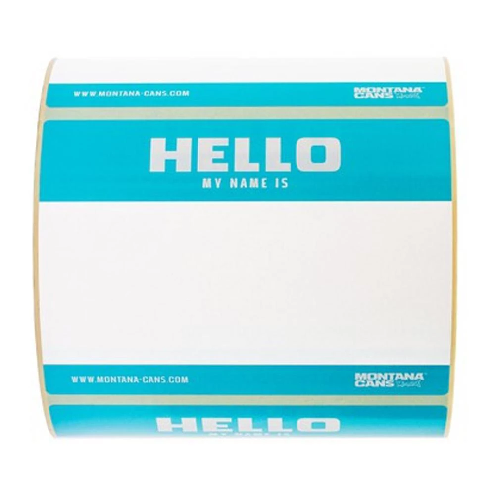 Montana HELLO MY NAME Roll of Stickers The “hello my name is …” sticker, made from coated label paper, is on the roll of 500 pcs. The roll is perforated all 4 stickers, so you can easily break them into smaller units. A single Montana Hello my Name Stickers measures 12cm x 9cm.