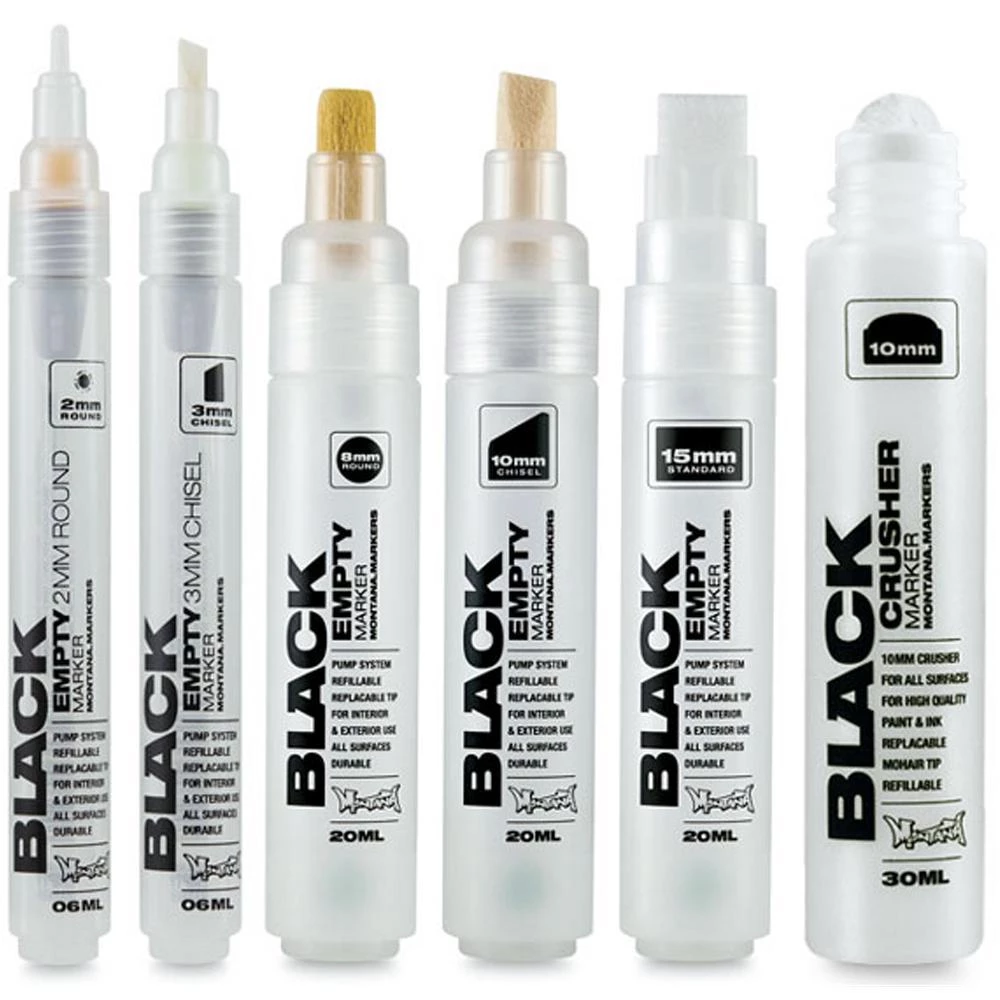 The refillable Montana Black Empty Markers allow artists to customize their marker collection by filling with the acid-free ink of their choice and mixing to create their own colors. They feature a special pump system for optimum flow control, and come in a variety of nib sizes.