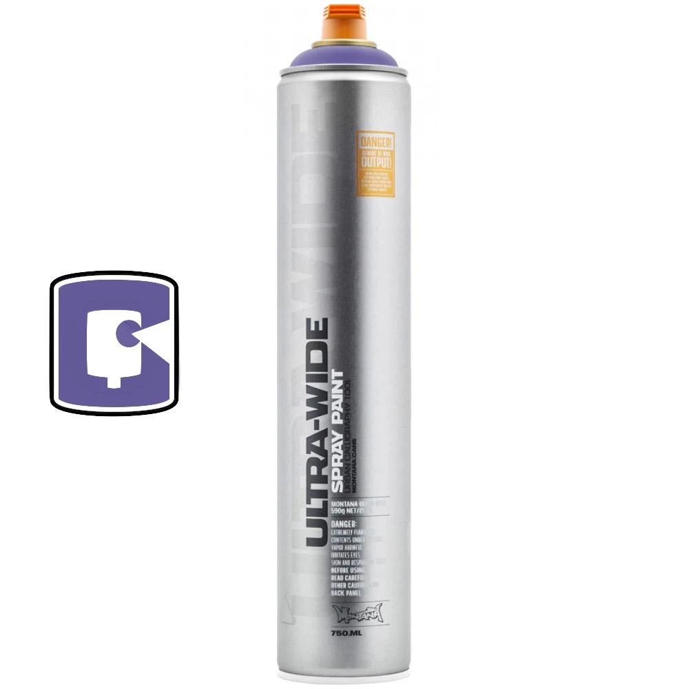 The largest member in the Montana Cans family is the 750ml ULTRA-WIDE can. An ideal tool for contemporary urban calligraphy and ultra wide line work. Comes in Chrome, Black, Red, Blue, Royal Purple and Nappies with a spray width variation from 15cm if applied rapidly at close range, to approx. 60cm if applied slower at a greater distance to the desired surface.