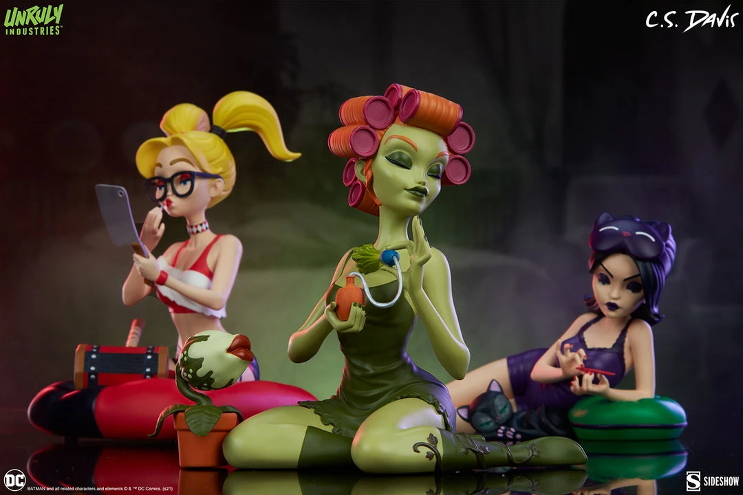 Gotham’s very own Maid of Mischief, Harleen Quinzel, is puddin’ on the ritz as she gives herself a makeover- looking sharp! Meanwhile, Pamela Isley has planted herself down for a cozy night inside, testing out a new perfume that is absolutely di-vine. Finally, Selina Kyle is packed with purrsonality from head to toe beans as she files down her claws in a figure that is simply the cat’s pajamas.