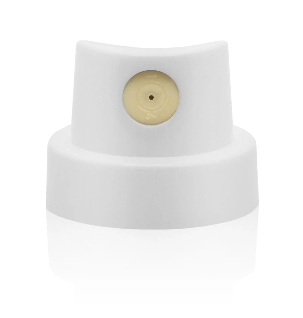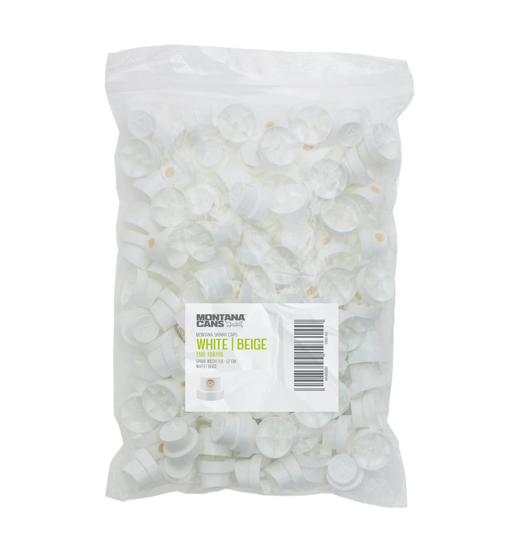 The Skinny Cap White/Beige is the classic smooth skinny cap that has a long history with the Montana Cans, Montana GOLD range. Its round form body makes it a comfortable Skinny Cap that is still loved for outlining by graffiti artists, street artists or urban artists alike. Its smooth application is ideal for small-scaled detail work and clean linear output, which is commonly required for outline classic letter graffiti. Previously the standard cap on the old Montana GOLD series, the Skinny White/Beige caps can still be found in its Corporate Identity color scheme (gold/beige) as the standard manufactured cap on the Montana GOLD range. Fitting on all female valve cans, the Skinny White/Beige cap has an average spray width of 1cm that is minimally grubby. The spray width changes with the used distance to the object. For skinnier lines, spray from a closer distance. For fatter lines, spray from a further distance.