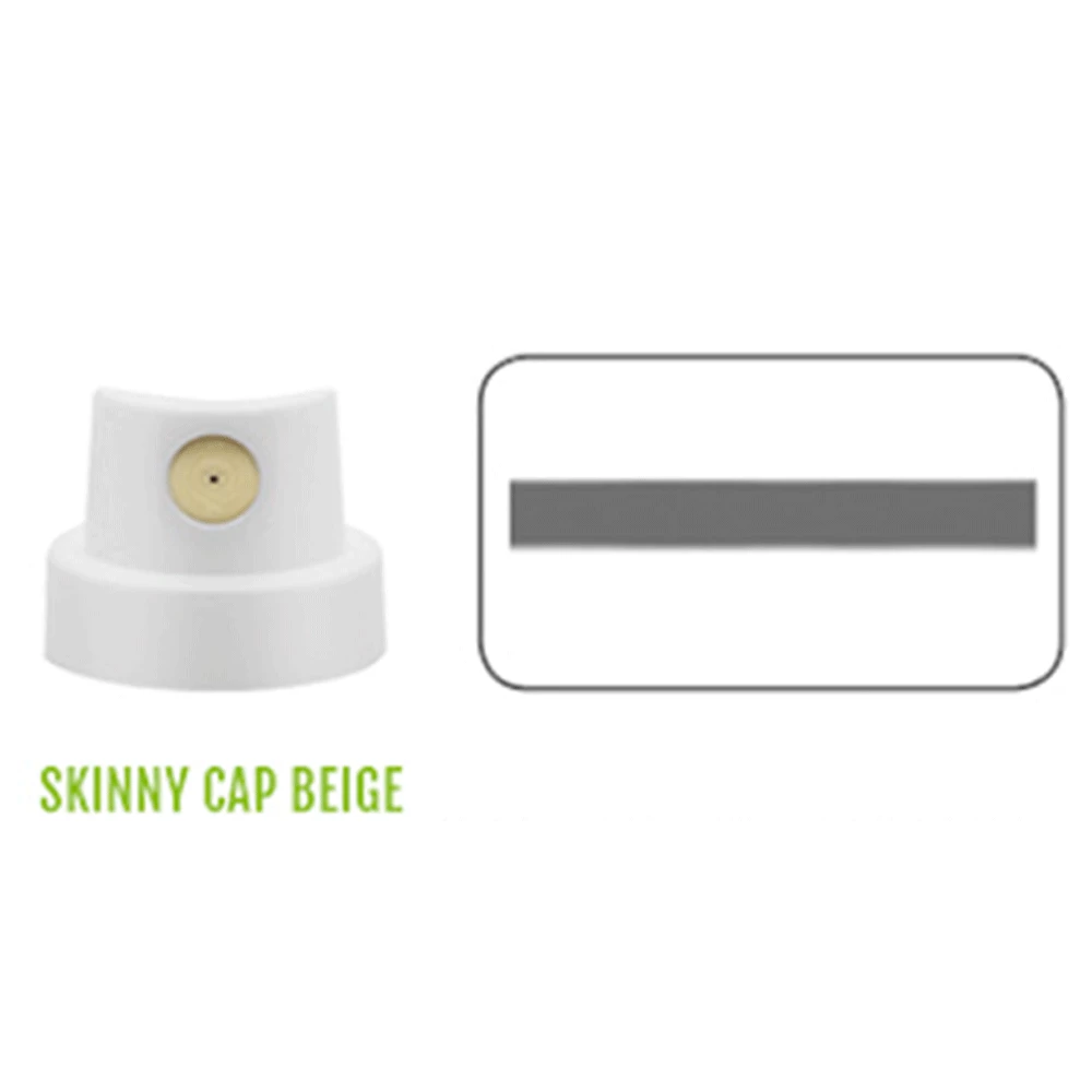 The Skinny Cap Beige is a cap for a fine average spray width of ca. 1cm (0.5“). Perfect for fine works, but minimally grubby. The spray width changes with the used distance to the object. For skinnier lines, spray from a closer distance. For fatter lines, spray from a further distance.