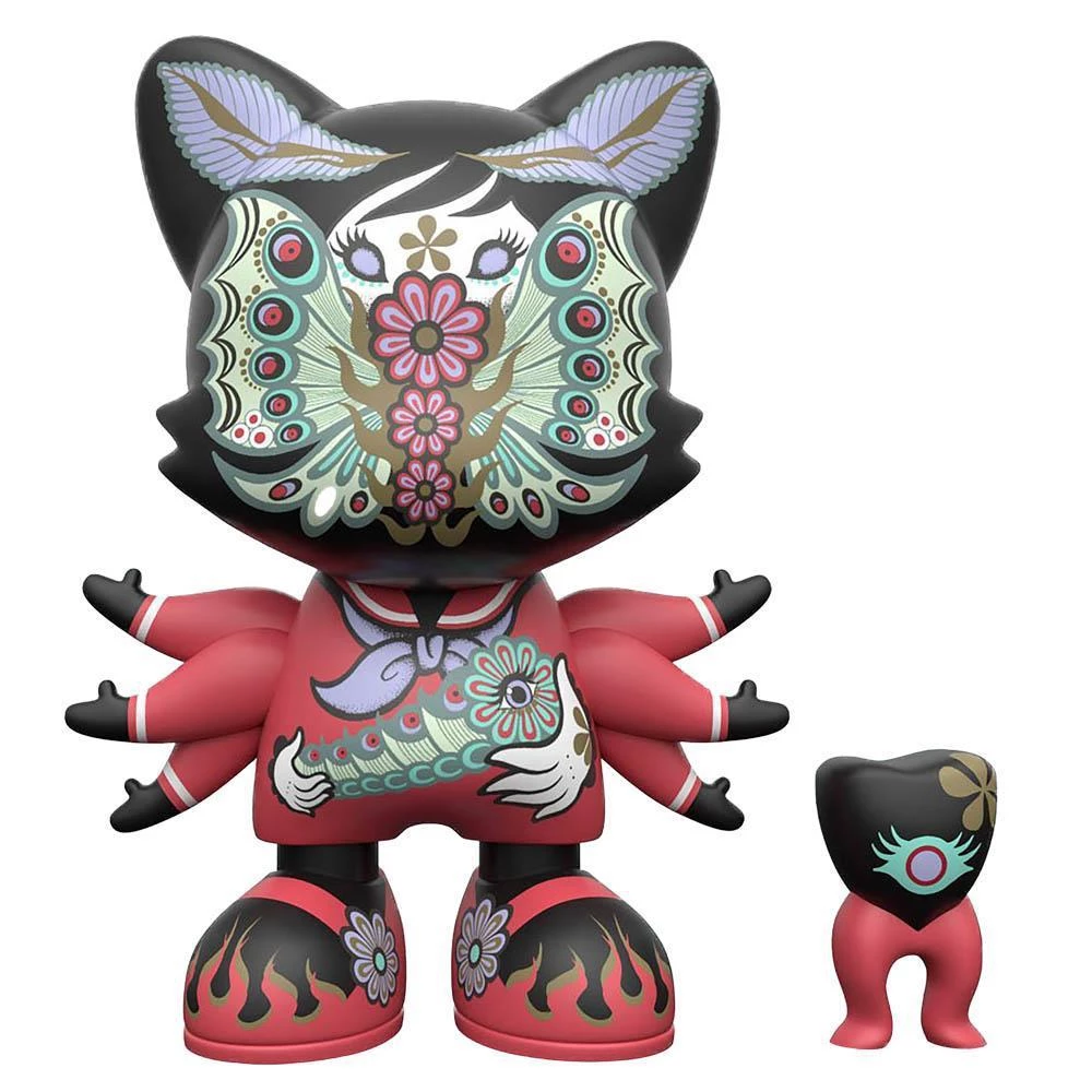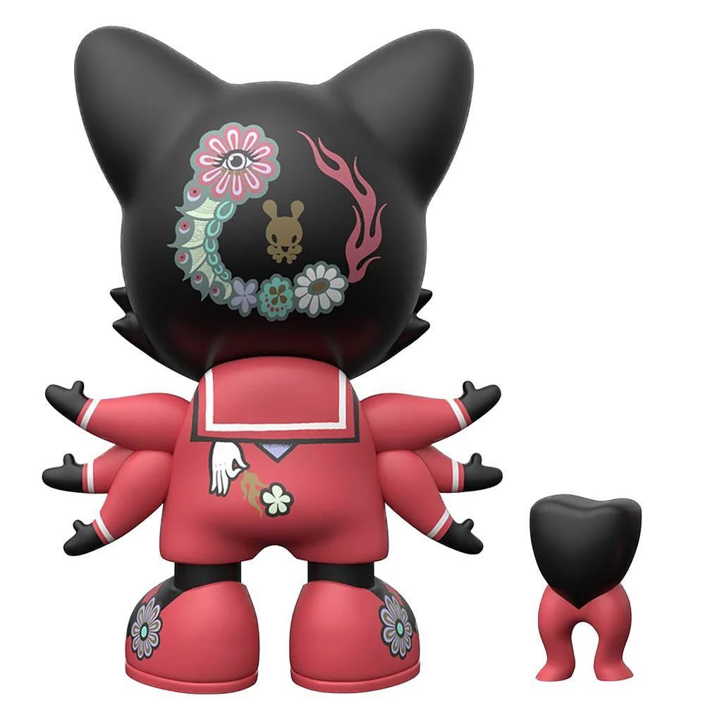 Based on Junko’s iconic design from Superplastic’s Janky Series One, Japanese artist Junko Mizuno’s fierce Lotus SuperJanky deity is a famous protector of cats and young women. Dressed in a traditional Japanese schoolgirl uniform and fiery shoes, Lotus is accompanied by its faithful companion, a magical tooth.