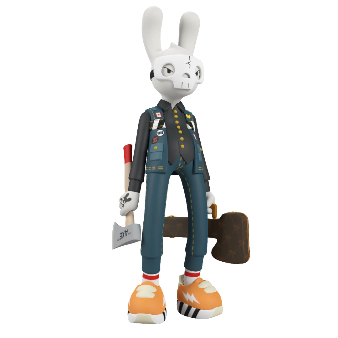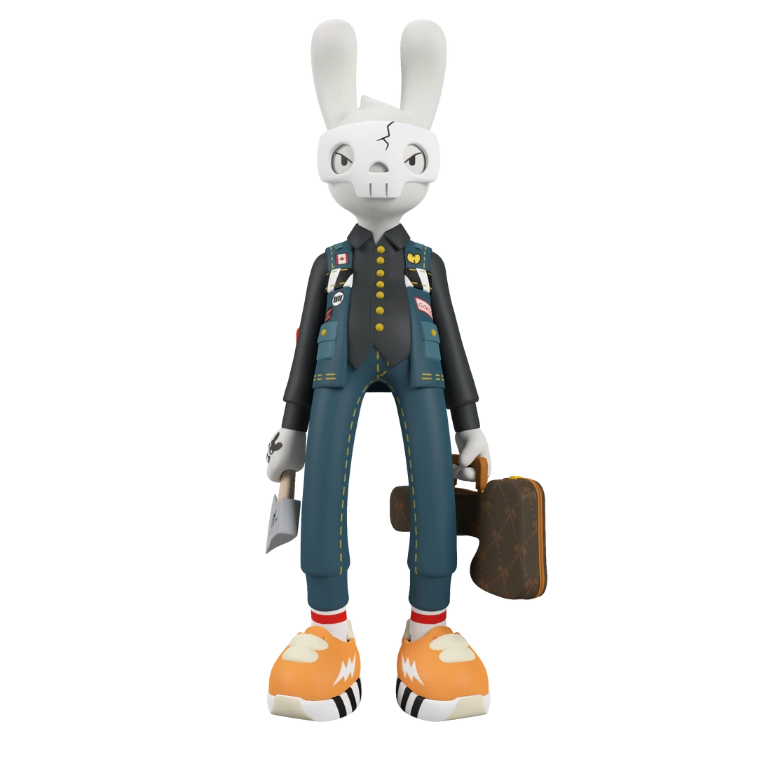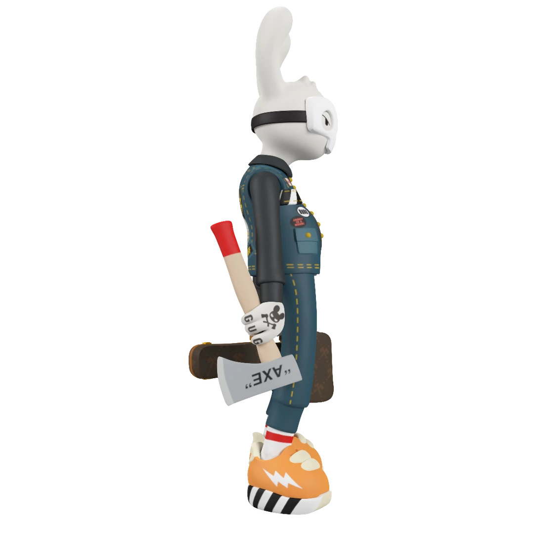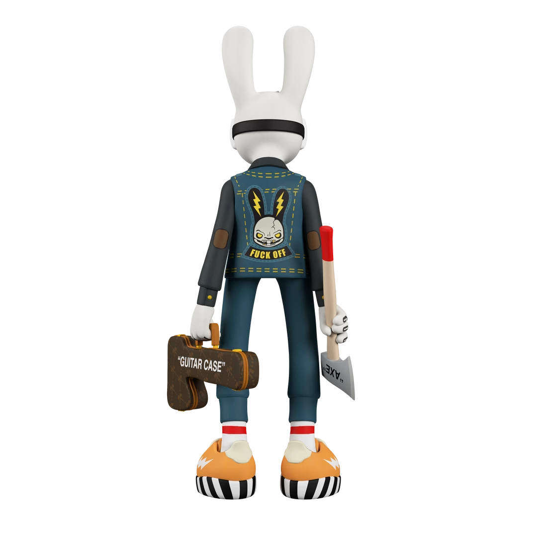 The second giant 12-inch vinyl tall variant by legendary synthetic hip-hop horror star Guggimon is here! “High Voltage” is all dressed up in his Canadian tuxedo and ready for havoc with axe, “guitar case,” mask, and a bad attitude on the back of his jacket.