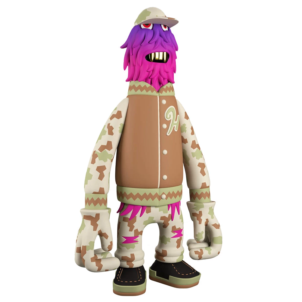 When Area 51 can’t find one of their missing “experiments,” there’s only one beast they call to recover these zombie virus-infected extraterrestrials: Hench, Undead Recovery Agent for US Strategic Command. Decked in day-glo camo and sporting an electroplated gold grill with “NOT ME” boots. Legendary UK Artist Pete Fowler’s magnificent 9-inch monster is ready to explore the desolate dunes of the deep desert in hopes of stumbling upon a flesh-eating skinwalker dining on some glampers.