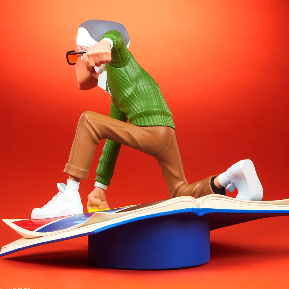 Measuring 9” tall and 9.4” wide, this energetic representation of Stan “The Man” Lee strikes a super heroic pose, landing a punch with an explosive burst of yellow. Leaping off the pages of a colorful comic book-themed base, the creative visionary is clad in his signature green sweater, tinted shades, and super smile, just as iconic as any hero’s mask or four-color costume.